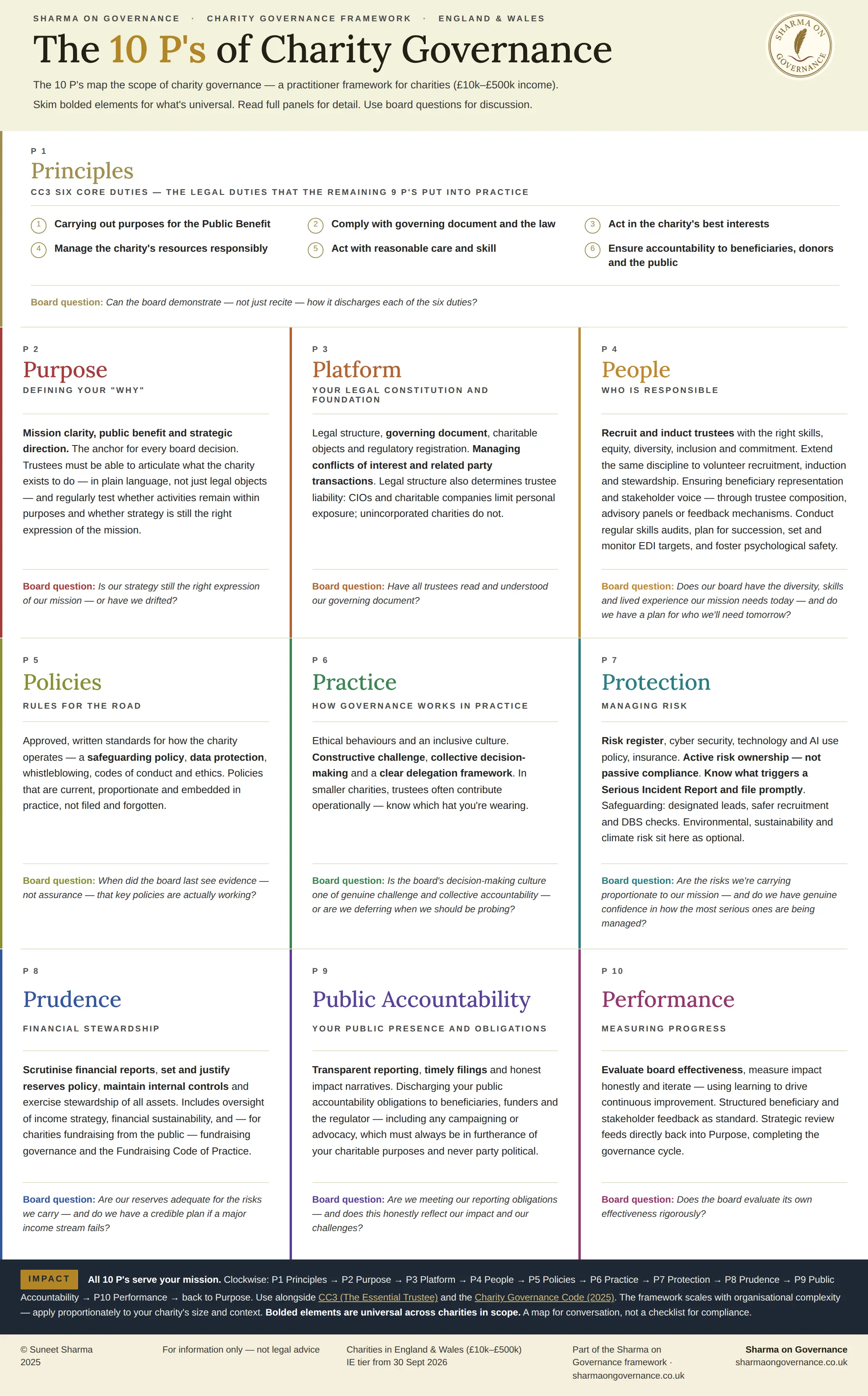 Use the 10 Ps to build governance foundations and help you navigate the Charity Commission guidance, then use the Charity Governance Code, which sets best practice, as your ceiling for continuous improvement.